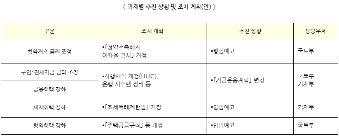 이번 금리 조정과 관련된 개선 사항 중에서 청약저축 및 대출금리 조정, 금융혜택 강화는 8월 중 시행될 예정이며, 세제 및 청약혜택 강화는 법령 개정 등 절차를 거쳐 올해 하반기 중 완료 예정이라고 하니 아래 표를 참고하시기 바랍니다.