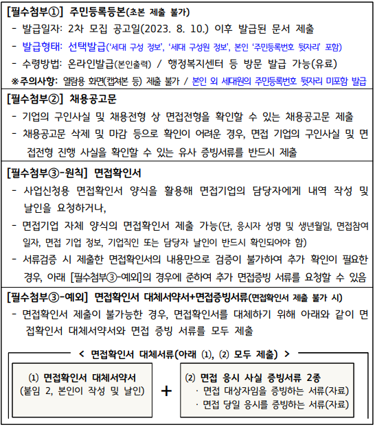 필수 첨부 제출 서류로는 주민등록등본, 채용공고문, 면접확인서 이렇게 3가지가 있습니다.