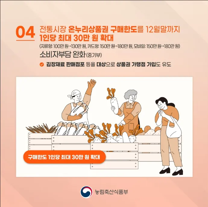 전통시장에서는 아무래도 온누리상품권을 많이 이용하실 겁니다. 그래서, 중기부에서 소비자 부담을 완화하기 위해 전통시장 온누리상품권 구매한도를 12월 말까지 1인당 최대 30만 원 확대하였습니다.