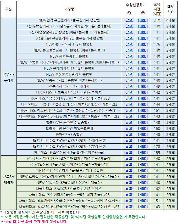 직업훈련생계비 대부 대상 훈련 과정은 140시간 이상 과정만 대상이 됩니다. 아래 실업자와 구직자, 근로자와 재직자 가능 과정을 참고하시기 바랍니다.